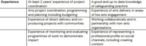 • The role will support the delivery of our creative programme. Specific activity will be delivered in collaboration with the role’s line manager and Managing Director of Junction Arts.
